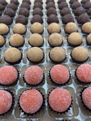 Brigadeiros are handcrafted treats, very traditional at birthday parties, weddings, and any events in Brazil. Some people say it is a fudge, others say it is a chocolate truffle. We say it is a mix of fudge and chocolate truffle... and it is delicious!!!